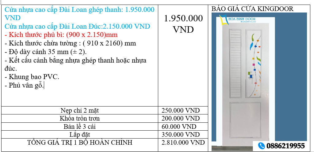 - Giá cửa nhựa đìa loan 900 x 2150 = 1.950.000 VND